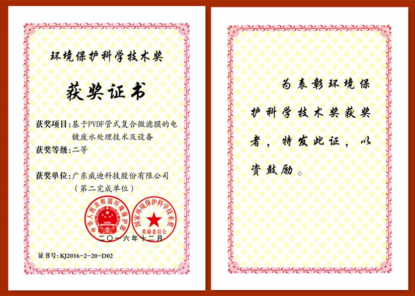 廣東威迪科技股份有限公司(股票代碼:870419)作為主要參與單位完成的科研項目“基于PVDF管式復合微濾膜的電鍍廢水處理技術及設備”項目獲得了2016年度中華人民共和國環境保護部以及國家環境保護科學技術獎獎勵委員會聯合頒發的的環境保護科技獎二等獎。